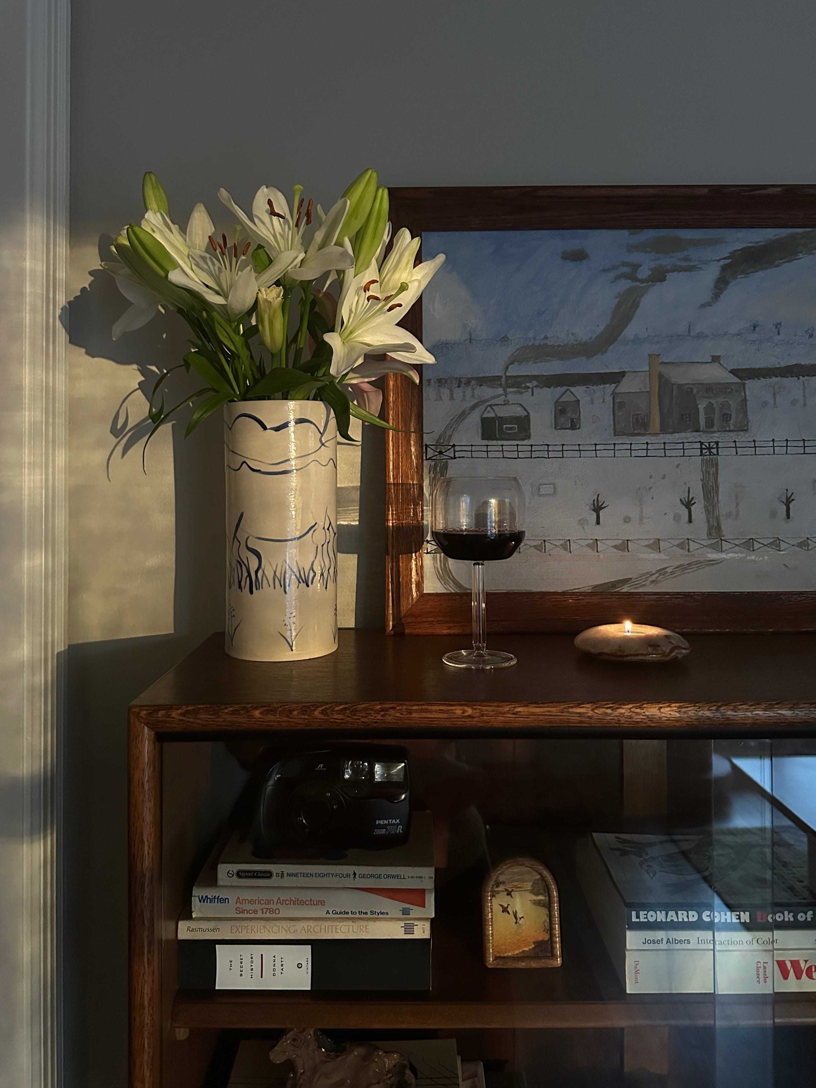 We’ve been frequenting Mother Lode and Decatur Estate Vintage Market to build our collection of vintage art and timeless furniture— roaming around to see what catches our eye naturally. This vintage glass book shelf and winterscape painting from 1985 drew us in immediately, it’s been a treat to fill it with our most special trinkets and watch the shadows cast against it during golden hour.